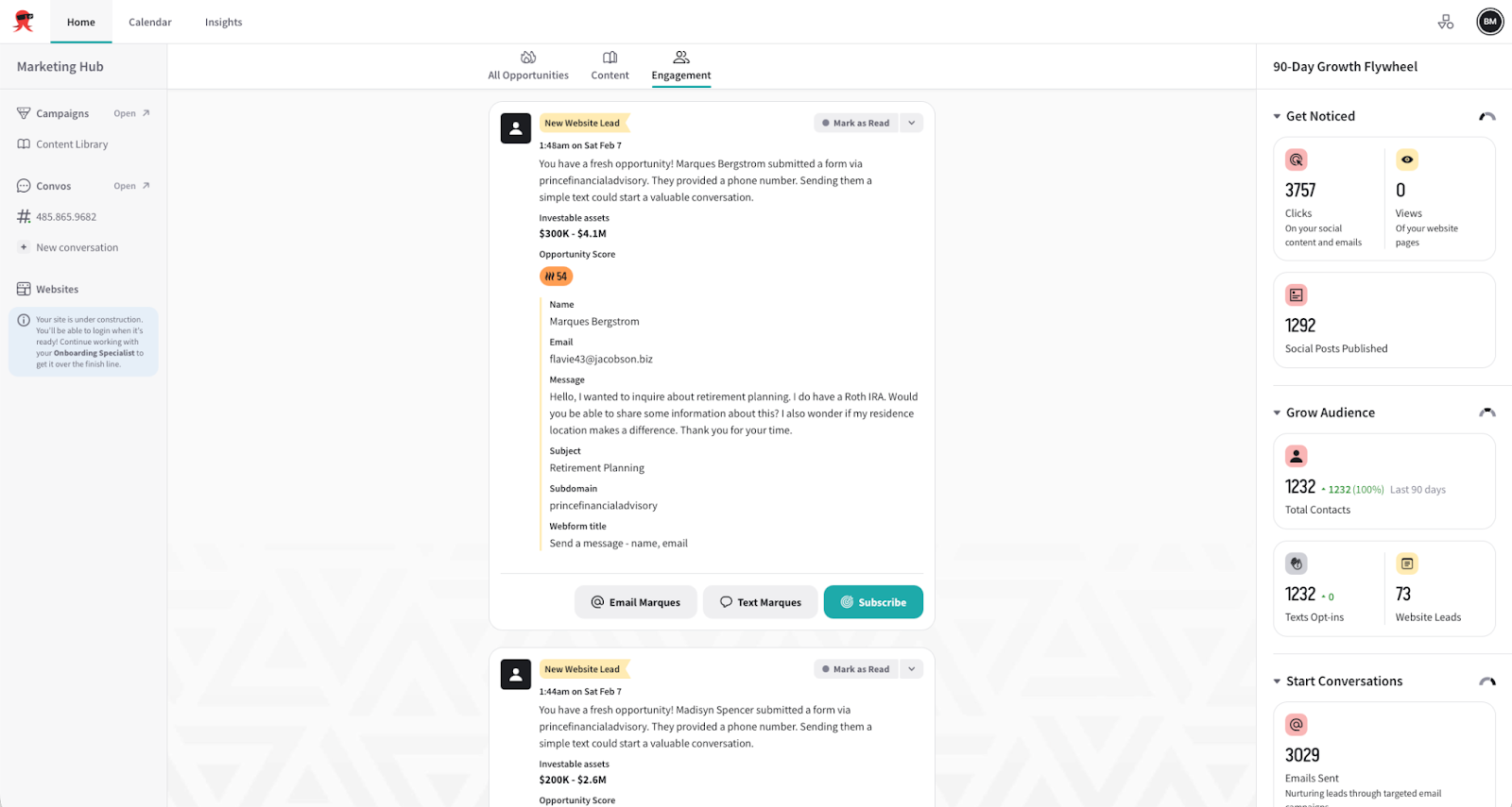 Here's what that looks like in practice. A prospect engages with one of your campaigns, or submits a form on your website. Their engagement score jumps to the top of the feed. You click in, send a quick note from the advisor's account: "Noticed you've been following the market updates. Happy to talk through what it means for your situation." Thirty seconds. That's a meeting.