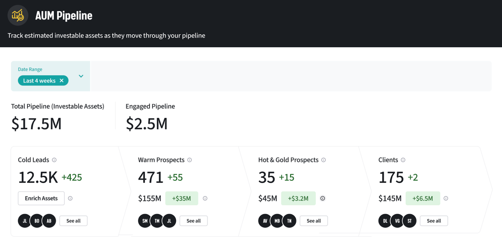 This changes the conversation with leadership. Instead of "we sent 500 emails this month," you're saying "we have $2.3 million in predicted AUM sitting in the warm prospect stage, and here's the campaign we're running to move them forward."