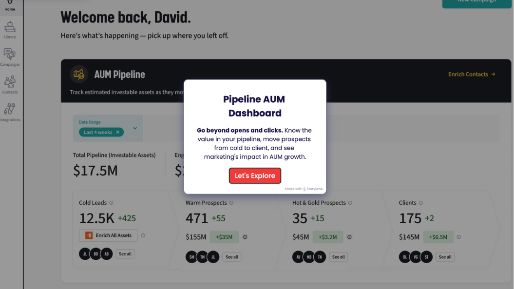 To answer that question, we built the AUM Pipeline Dashboard to close the ROI visibility gap. Instead of surface-level metrics, the dashboard shows the value of your pipeline in predicted AUM, where prospects are pooling across stages to highlight the biggest opportunities for movement, and how client AUM is growing over time.