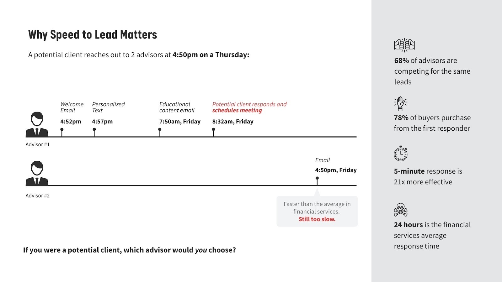 Every hour of delay costs you. Research consistently shows that responding within five minutes makes you dramatically more likely to connect and convert. The average financial services firm takes 24 to 48 hours. That gap is where opportunities die quietly.