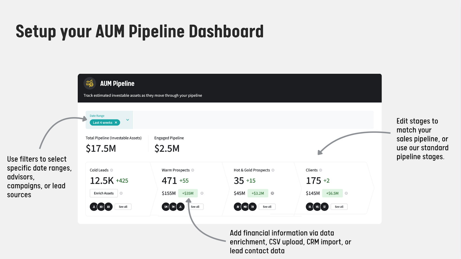 You can also enrich contacts with financial data, whether that's flowing in from your CRM, uploaded via CSV, or added through data enrichment tools. That makes your pipeline view even sharper: you're not just seeing how many prospects are at each stage, but what they're worth in investible assets.